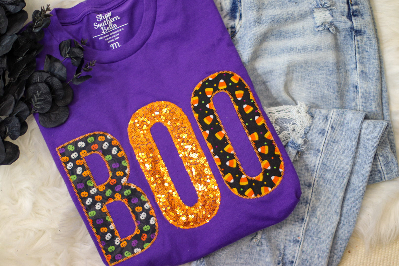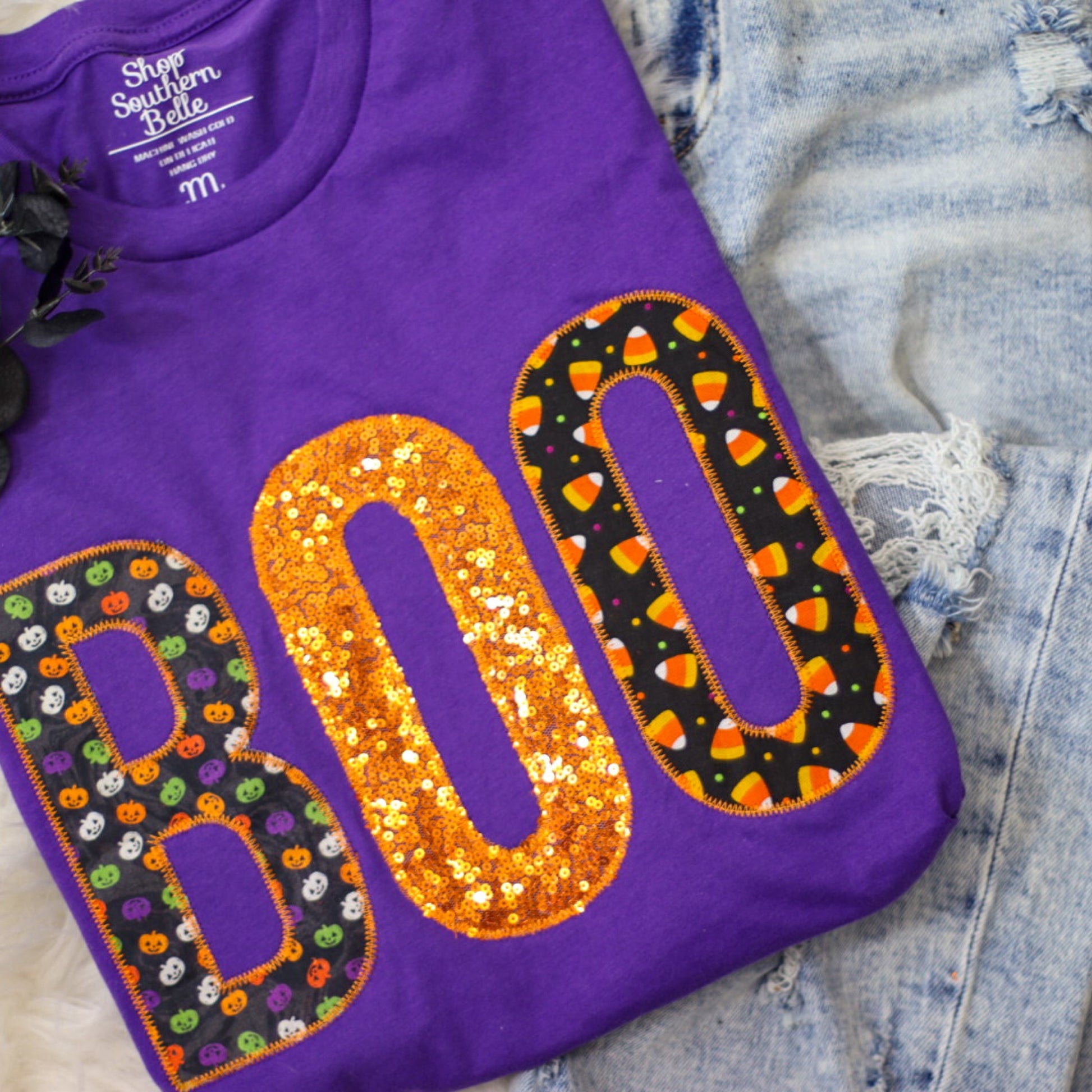 Show off your Halloween spirit with this adorable shirt! This unique item features a professional appliqued, REAL glitter design that is perfect for all the spooky season events!